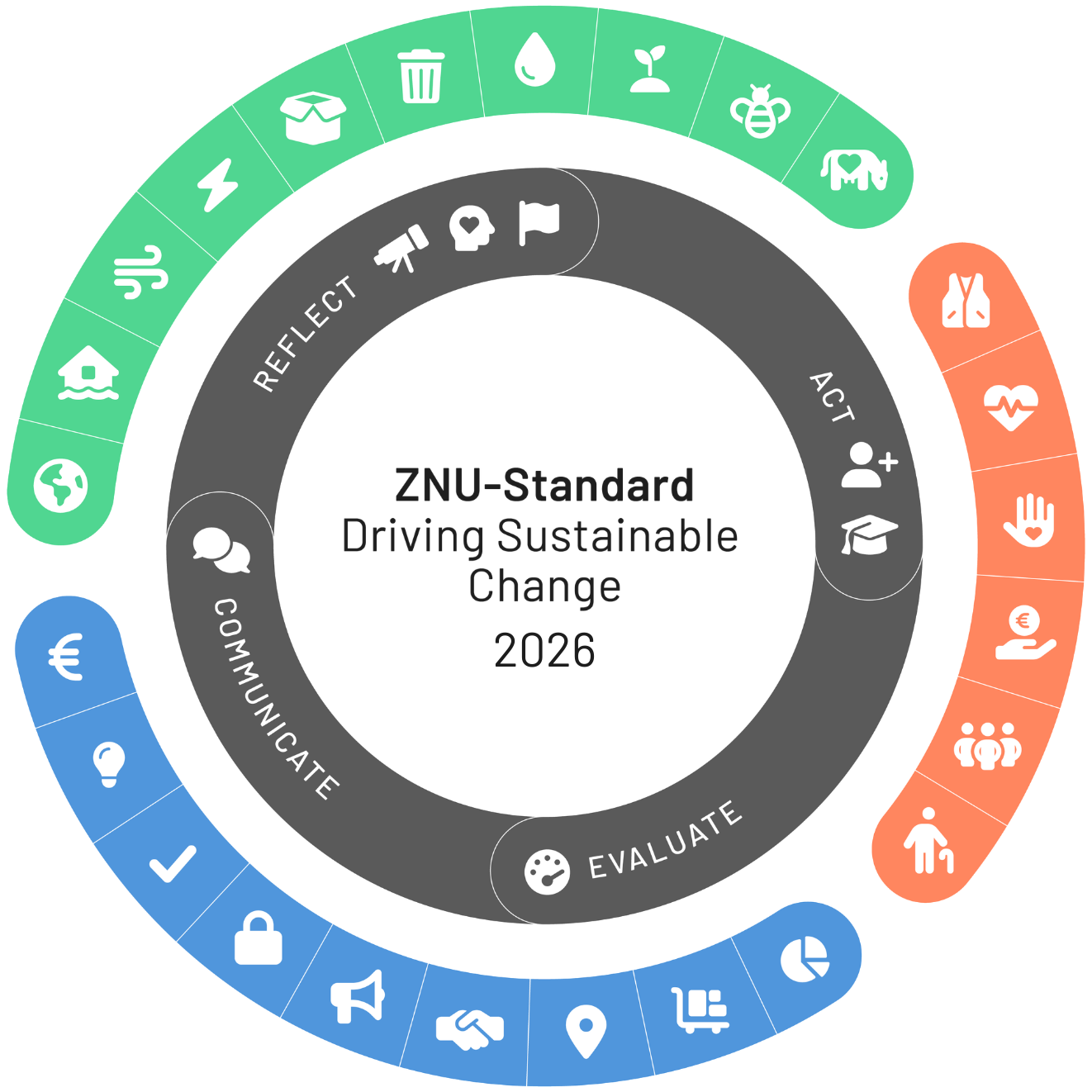 The ZNU SustainabilityCheck consists of 60 questions, each of which must be answered on a point scale based on exemplary activities. This rating system enables the company to track successes over time and benchmark itself against competitors. The ZNU SustainabilityCheck can thus serve as a basis for the regular review of the company's sustainability performance.